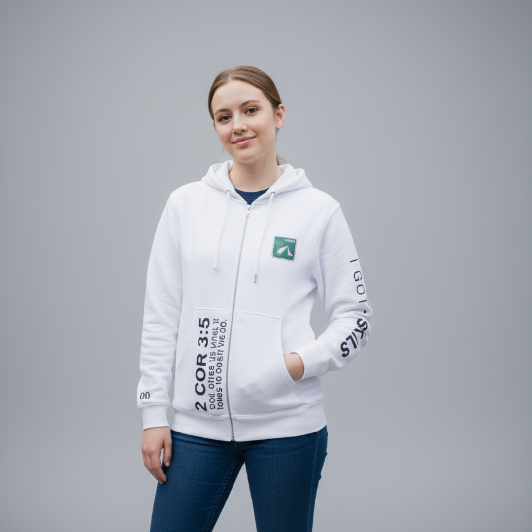 Inspired by the Camping Skills Pathfinder Honor, this hoodie celebrates the truth that, as Pathfinder leaders, we have been equipped by God with the abilities we need. The right side pocket features 2 Corinthians 3:5 — “God gives us what it takes to do all we do.” — a reminder that our strength and skills come from Him.